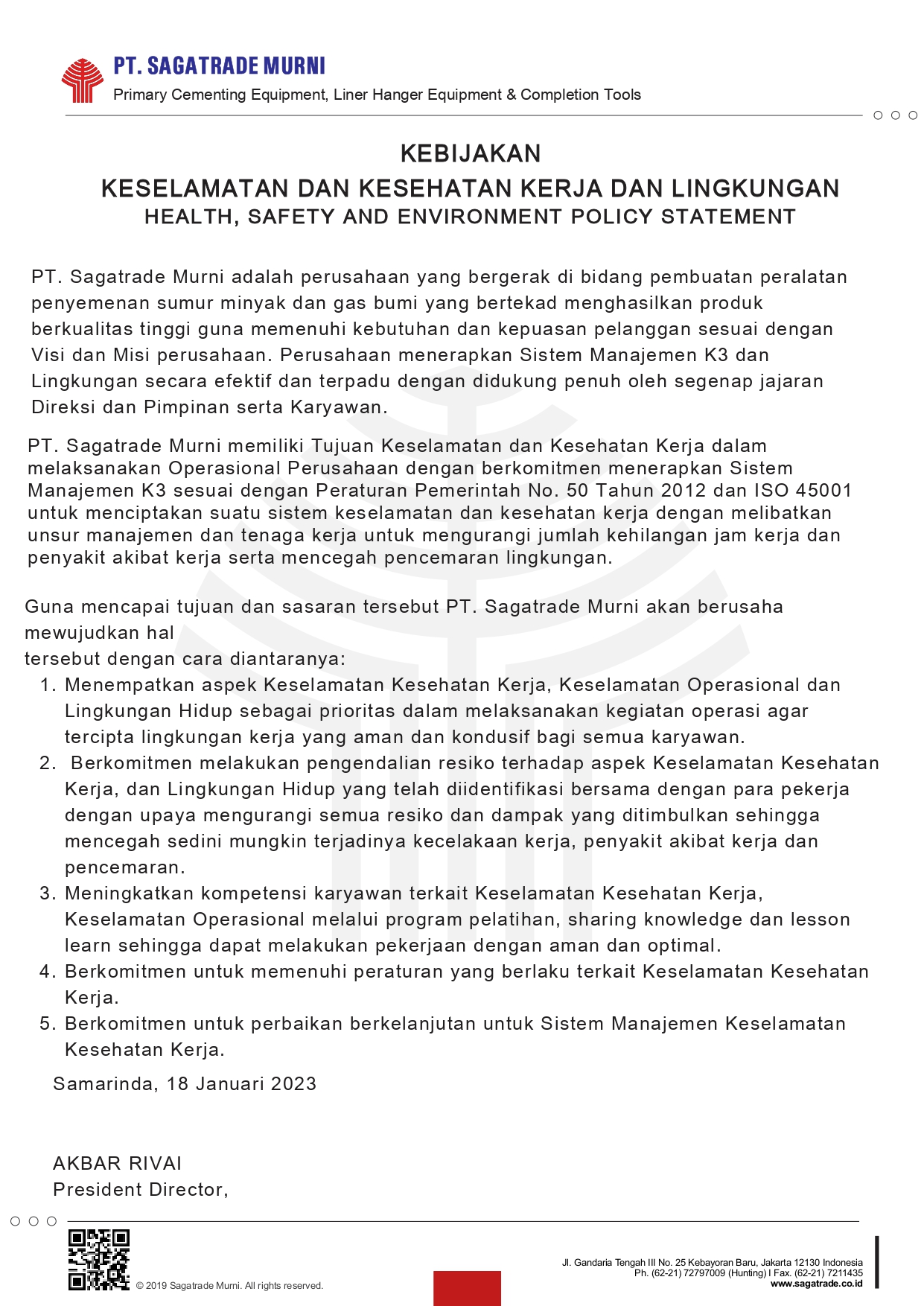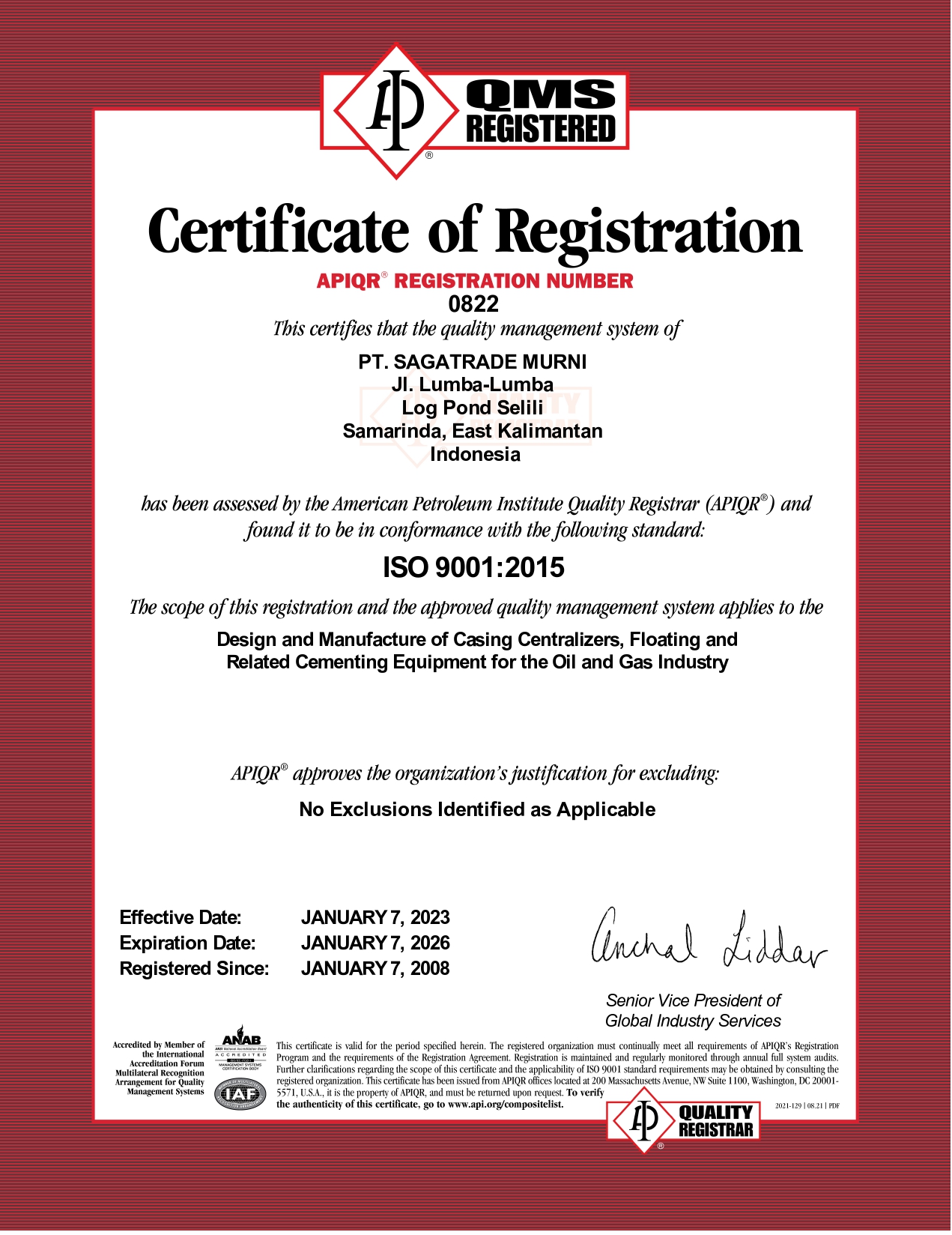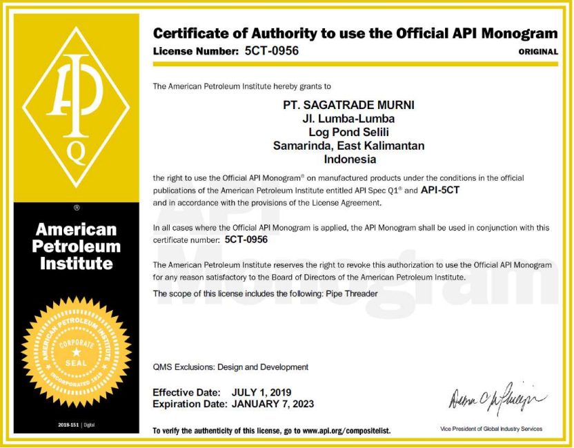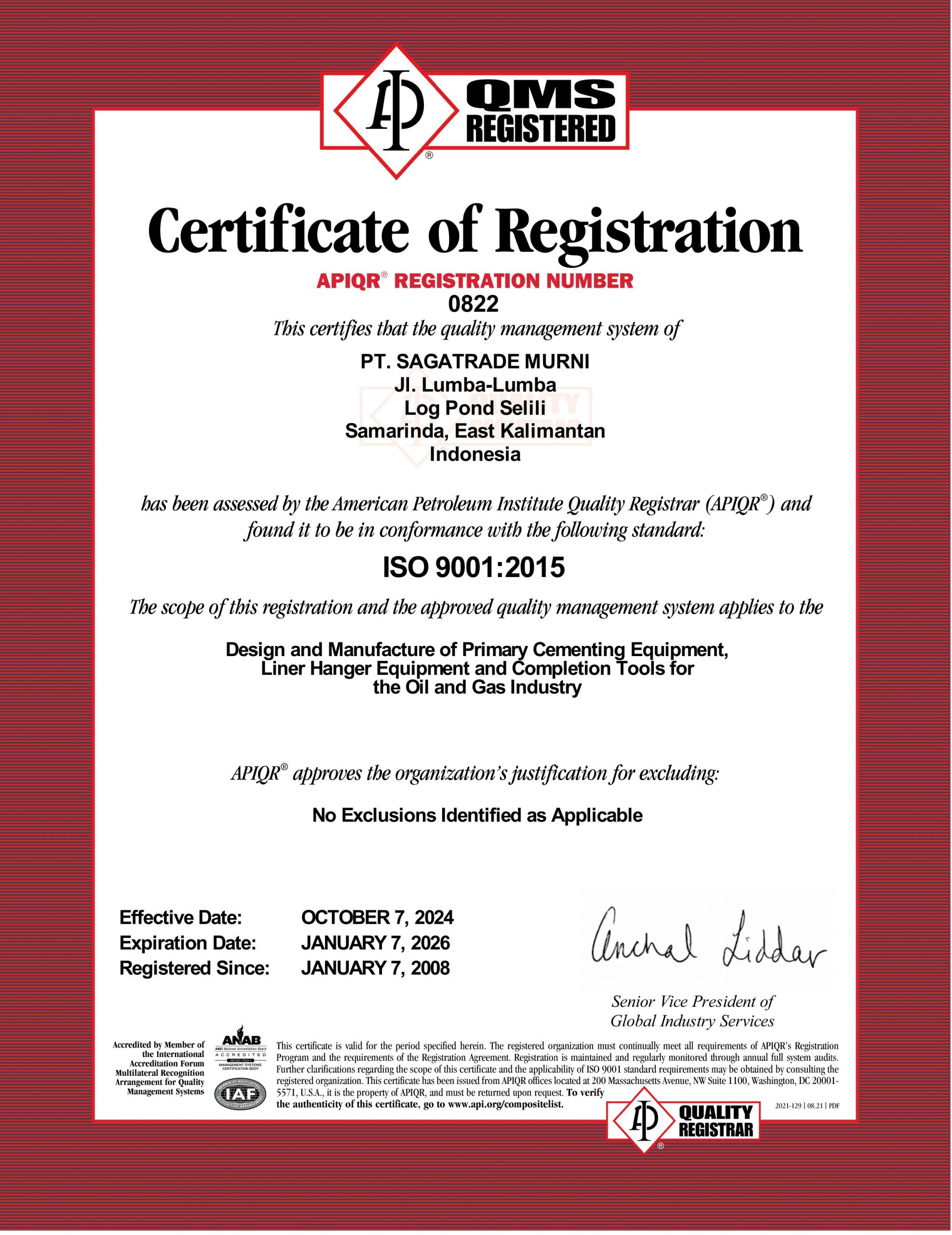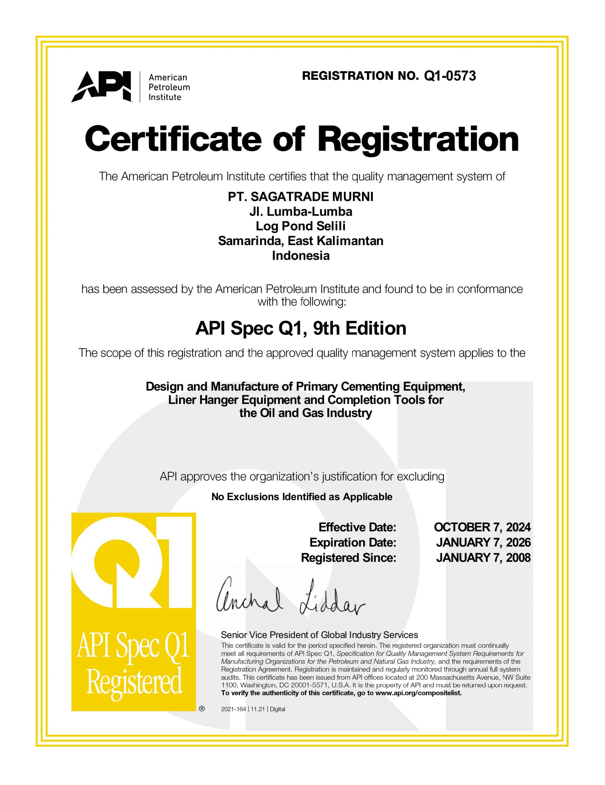 Over the years, PT. Sagatrade Murni has consistently adhered to high industry standards, as demonstrated by its numerous certifications from the American Petroleum Institute (API), including API Q1, API 11D1, API 19AC, API 14L, and API 5B, along with ISO 9001, ISO 45001 and ISO 14001. These certifications underscore the company’s commitment to quality management, safety, and operational excellence.